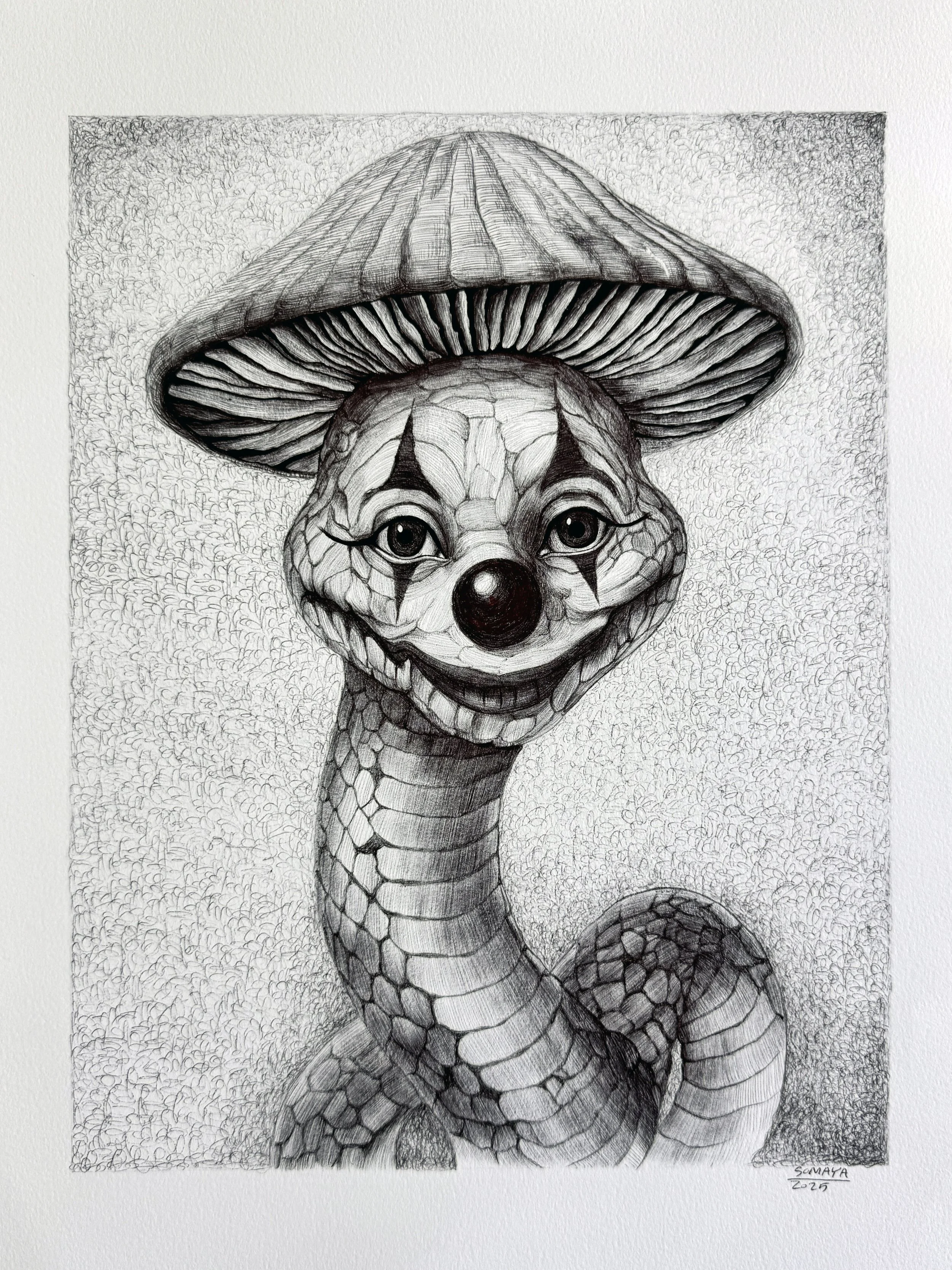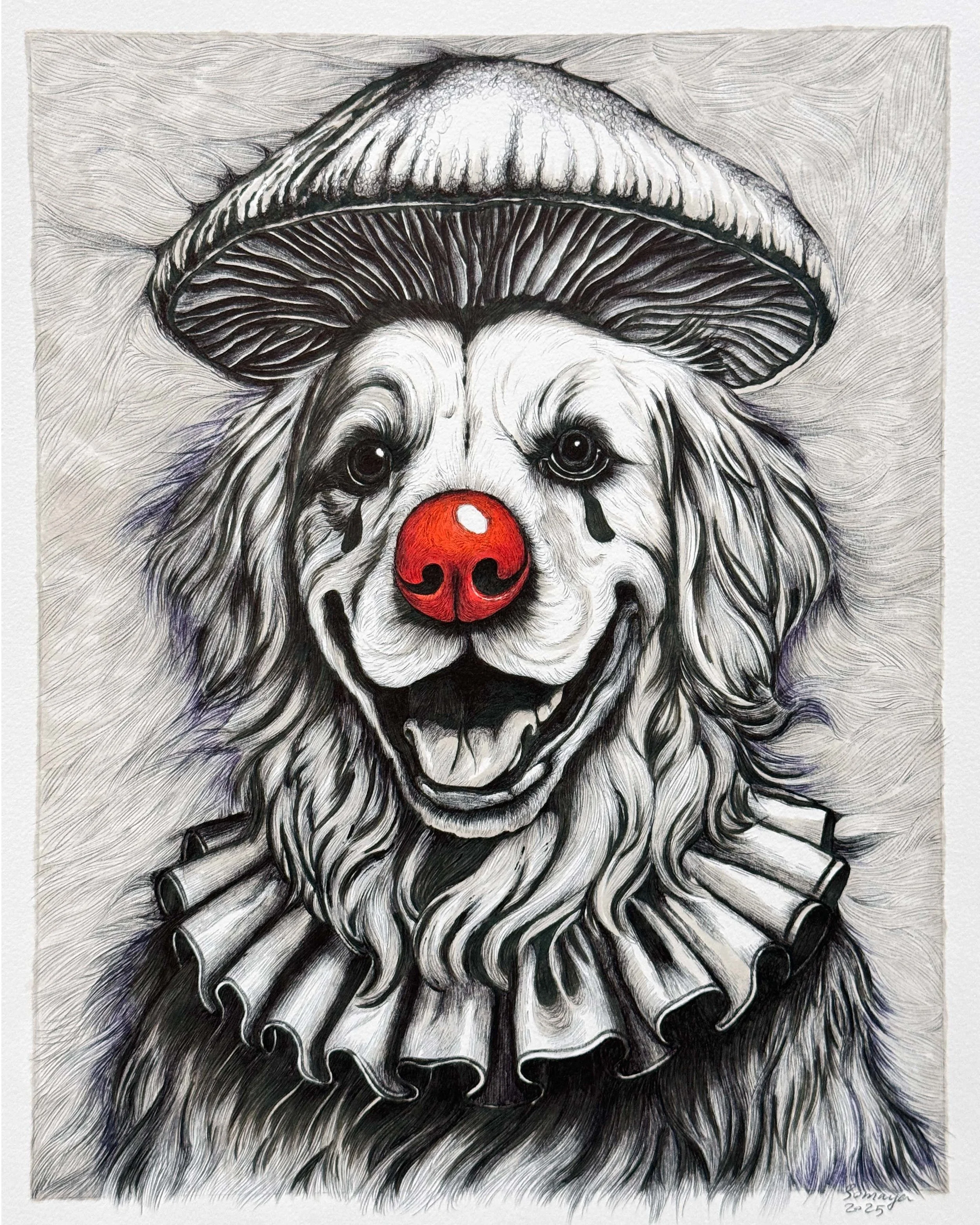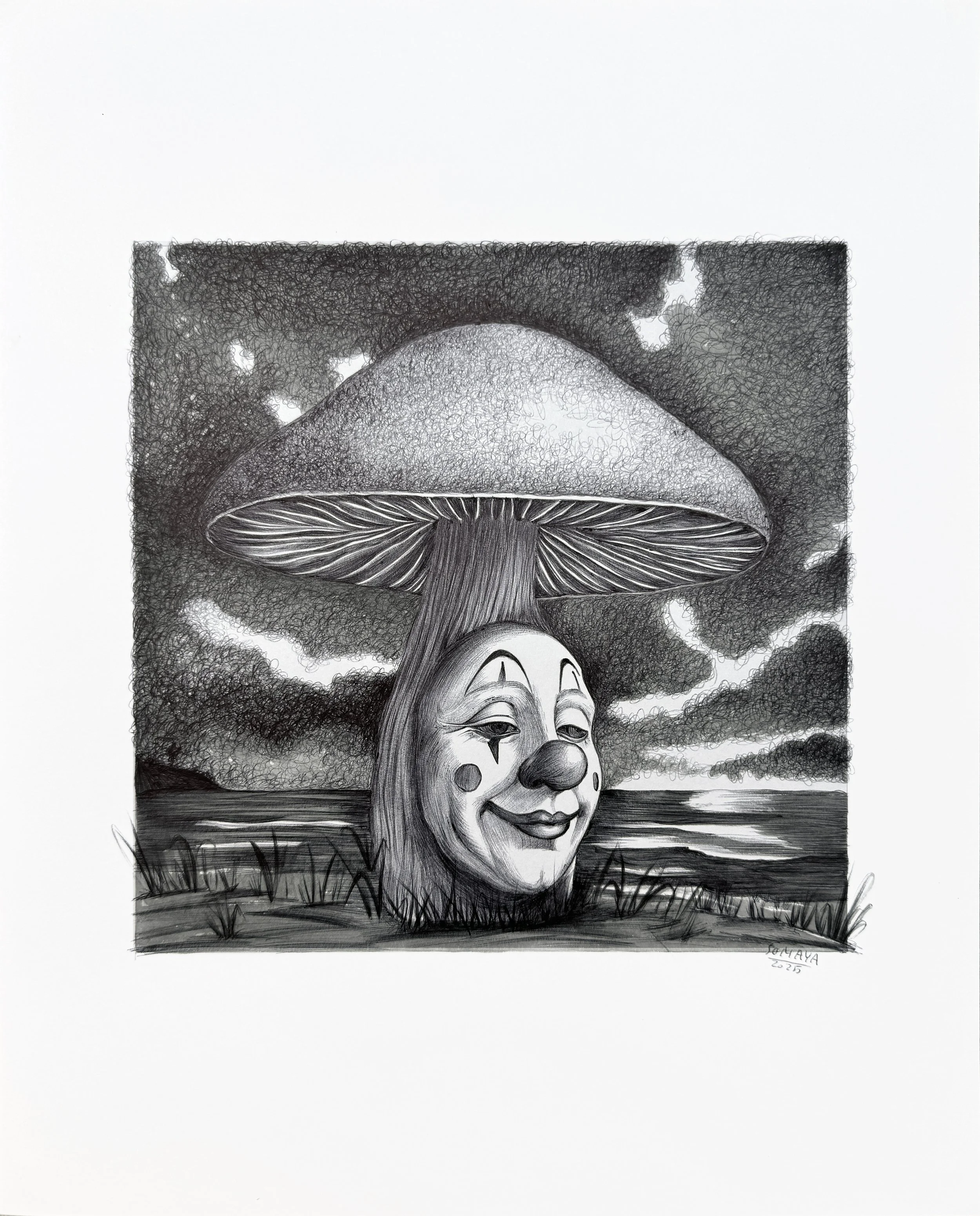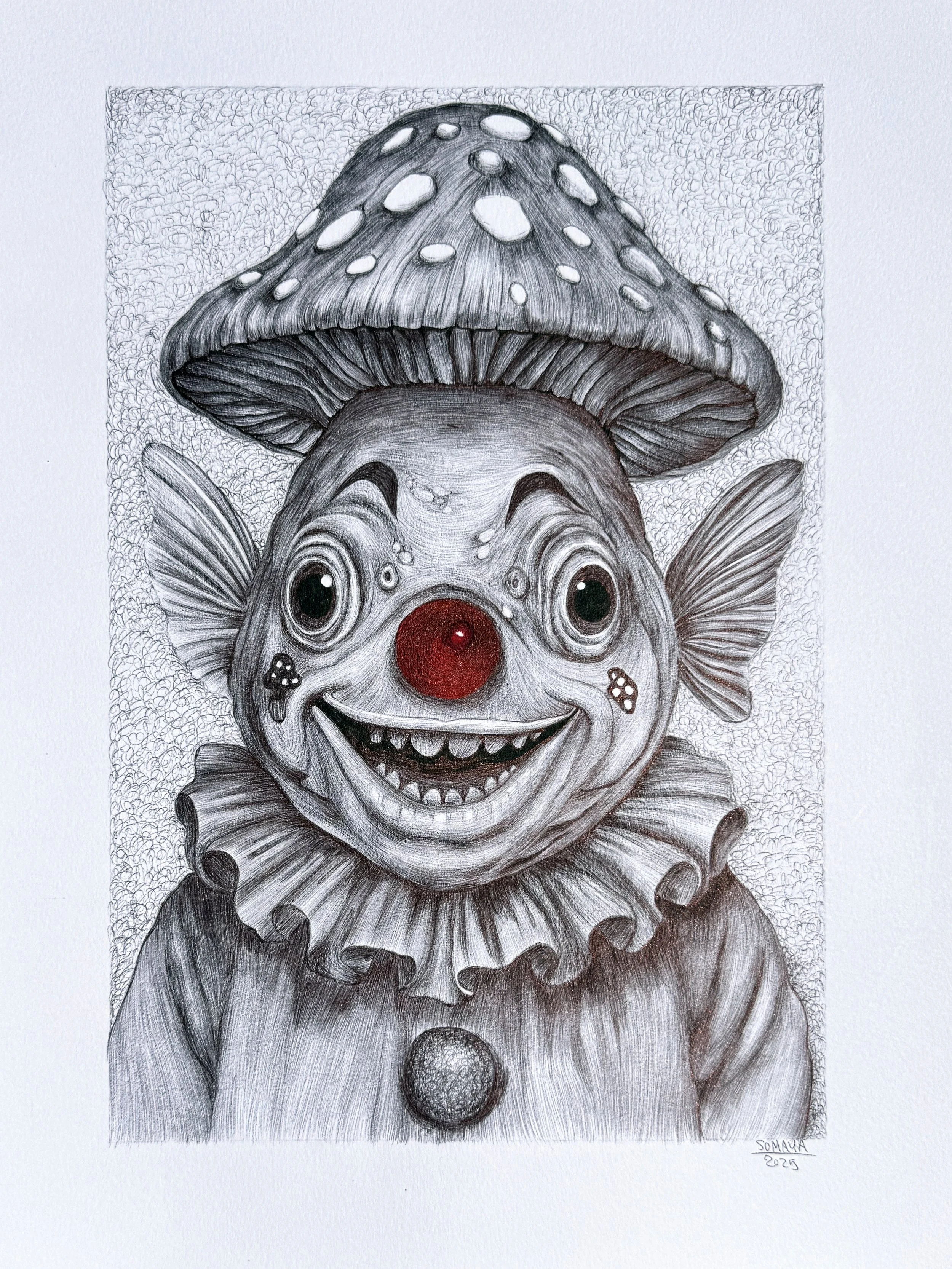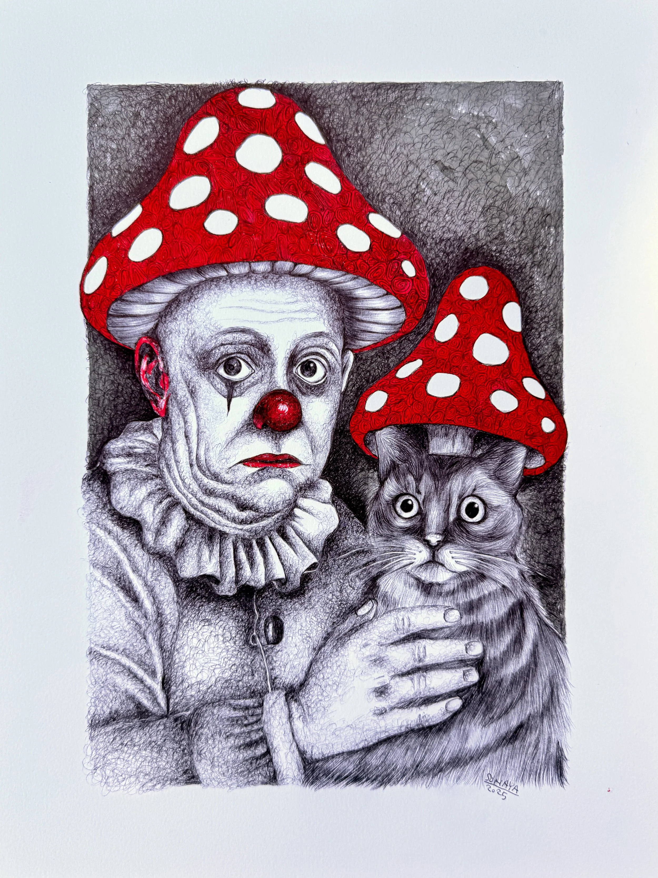 Clown and Mushrooms is a surreal exploration of the duality we all carry; the smiling mask we show the world, and the quiet truths we hold beneath. Each piece plays with the irony of joy and sorrow coexisting, using the clown as a symbol of emotional performance. The mushroom, strange and magical, emerges from darkness, representing resilience, hidden growth, and the beauty that thrives in shadow. This collection invites you to laugh, ache, and wonder...all at once.