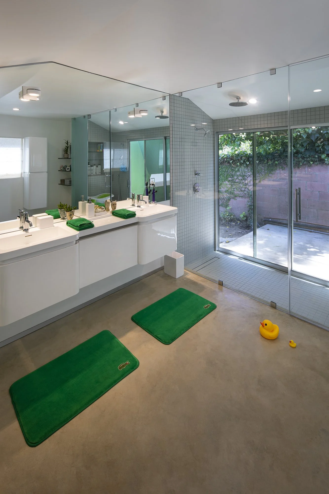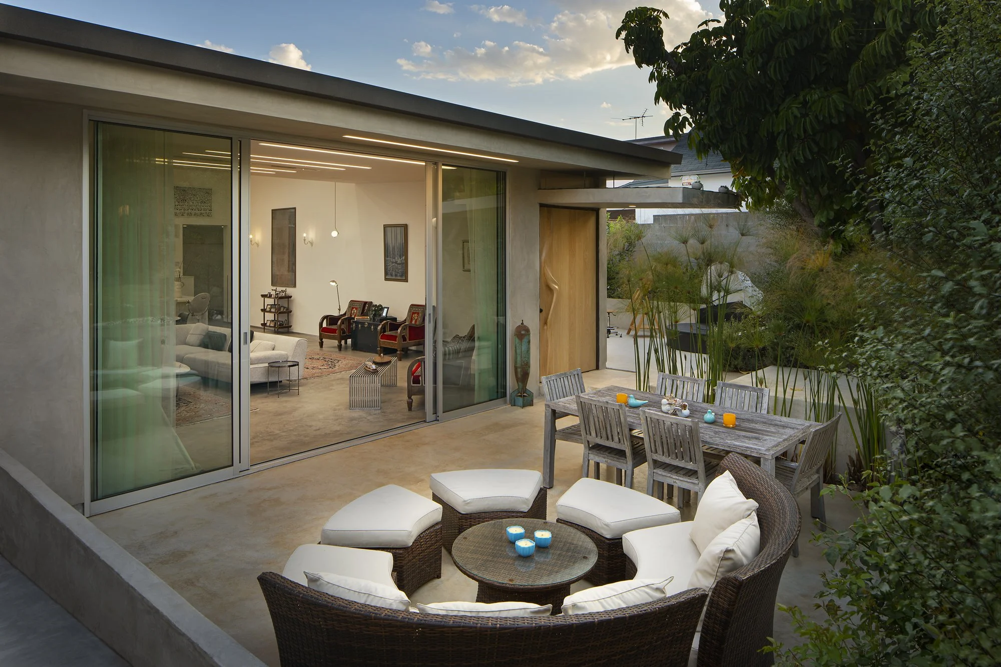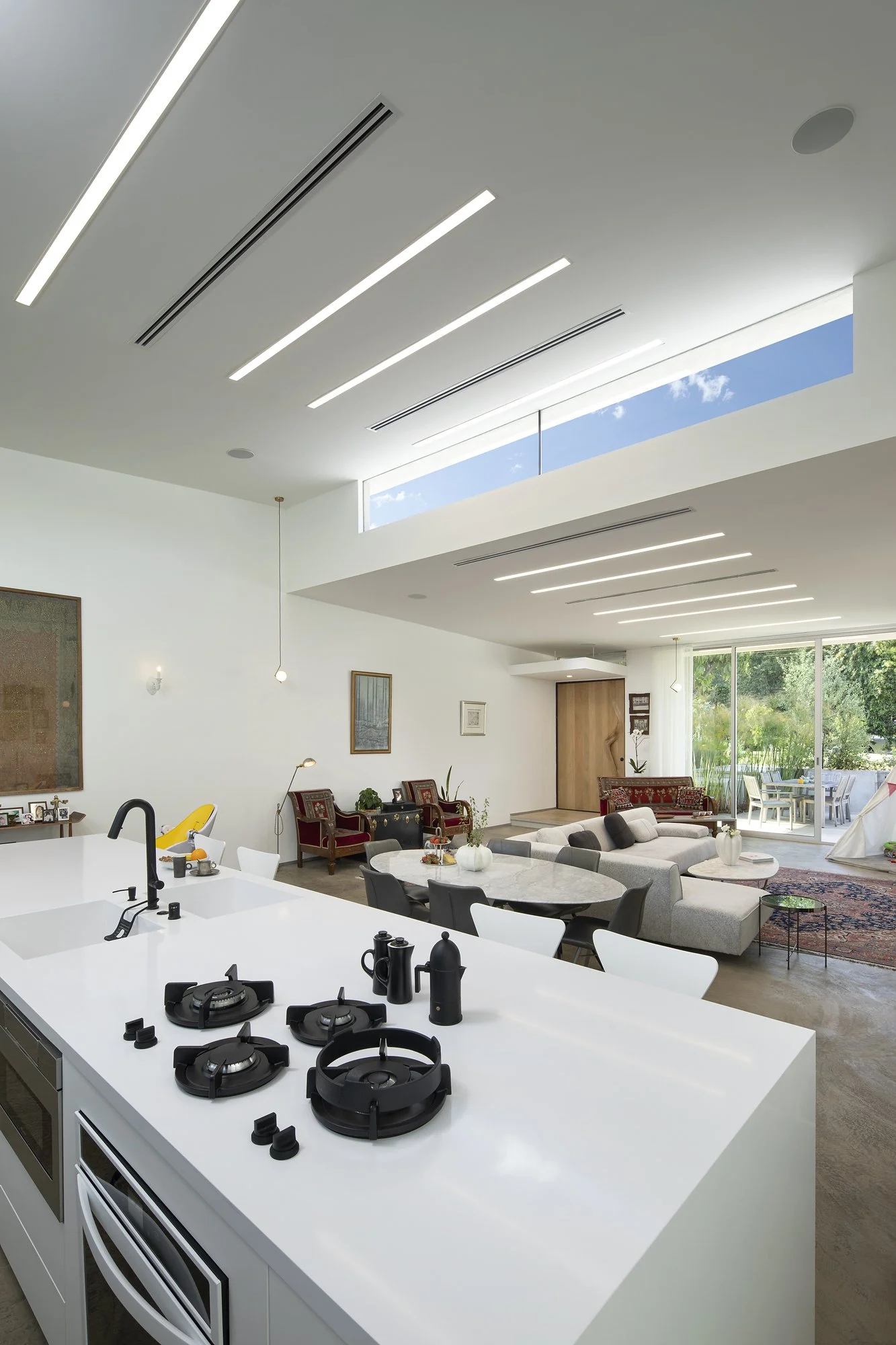 Custom large-format windows establish strong indoor–outdoor connections, while a central sawtooth window introduces consistent north light into the living space. Ceiling heights range from approximately 14 to 19 feet, reinforcing spatial variation throughout the house. A five-foot-wide linear cut through the plan—referred to as “the street”—serves as a circulation spine inspired by narrow streets in Iran, expressed through glass panels and a linear bamboo planting to maintain transparency while creating a distinct spatial memory.