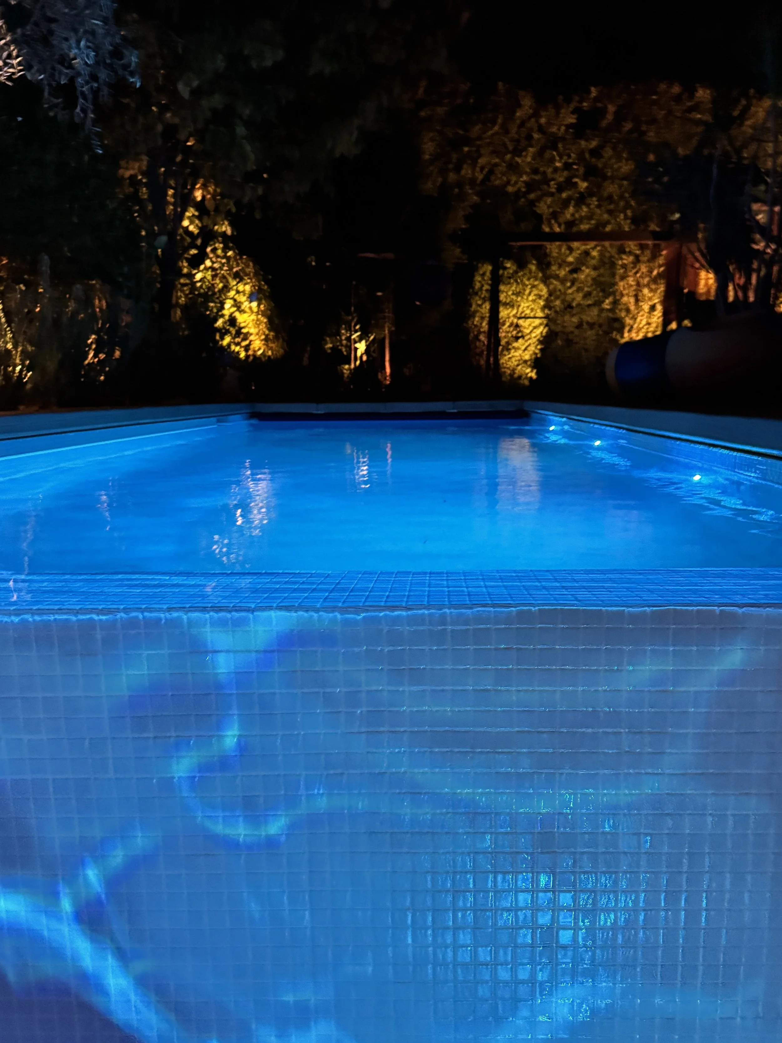 Secondary-phase pool project developed on a constrained lot as part of the Russell House design. Pool size and placement were defined by prevailing setback requirements. The scope includes a heated pool with electric cover, infinity edge, integrated spa with advanced jet pumps and air blower, adjacent cold plunge, and coordinated nighttime lighting.